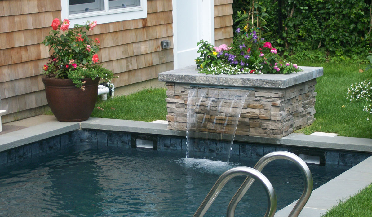 Bluestone Coping Pool Patio with Cultured Stone Planter / Waterfall