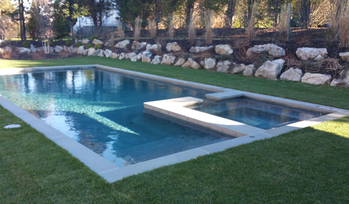 Bluestone Pool Coping with Boulder Retaining Wall along far side