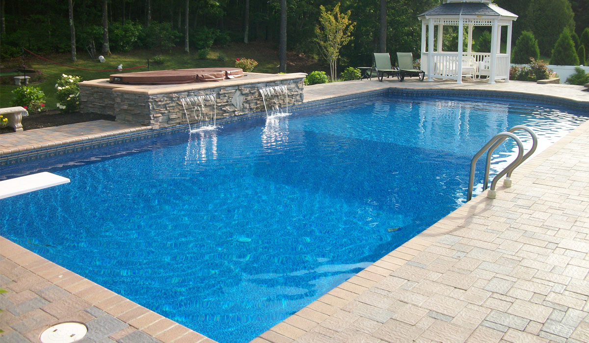 Pool Patio made with Nicolock Pavers, Hot Tub and Waterfalls in Center
