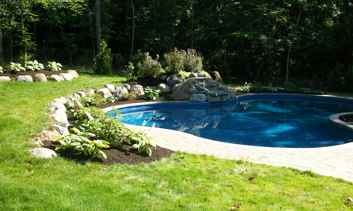 Poolside Boulder Retaining Wall, Waterfall and Plantings